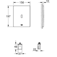 Minimalistisk design møder innovativ teknologi: GROHE Tectron Bau E infrarød skyllepladen med langtidsvarende batterier (op til 15.000 skyl) i en skinnende krom belægning tager bekvemmelighed og renlighed til nye højder med kontaktløs betjening. Den integrerede infrarøde sensor opfanger hånd- eller kropsbevægelse så vandet løber uden at du behøver og trykke på nogle knapper. Dette betyder at der er automatisk udskylning når du forlader toilettet. Det er også muligt at aktivere et ekstra skyl ved at vifte dine hænder, hvis nødvendigt. Skyllepladen tilbyder forudindstillede skylleprogrammer der kan justeres ved at dække sensoren med din tommelfinger: Du kan vælge det automatiske skyl og frekvens, indstille skyllevolumen eller deaktivere skyllefunktionerne for at rengørere toilettet. Kombineret med GROHE fjernbetjeningens (36407001, solgt seperat) ekstra tilgængelige indstillinger – plus monitorering af vand og energi forbrug. Brug pre-flush funktionen for ekstra hygiejne, eller indstil skyllevolumen efter dvæletiden. Alt dette og meget mere kan konfigureres til dine behov. Den holdbare GROHE Long-Life Shine krombelægning sikrer at din skylleplade vil forblive som ny i mange år. GROHE Tectron Bau E: udskylning uden berøring!